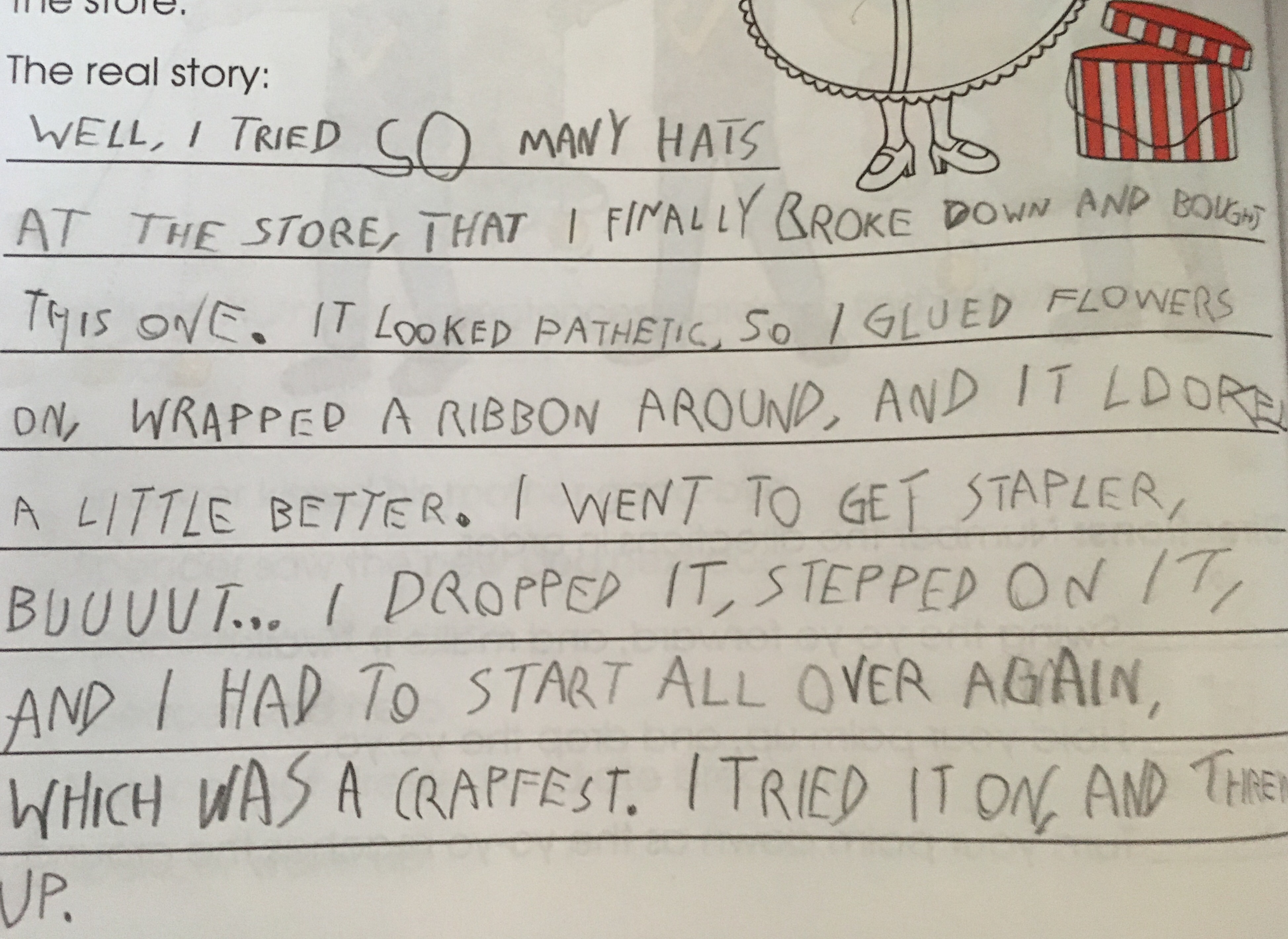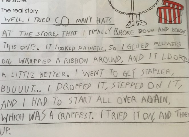My granddaughter did the assignment, writing the sentences in the correct order, but my grandson decided to have a bit of fun… he has an amazing imagination and loves to use it.