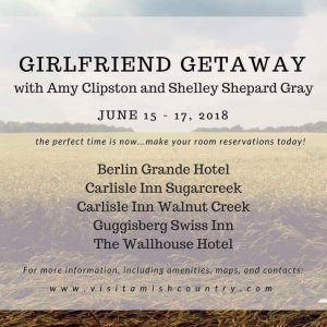 June 15-17. . . Girlfriend Getaway in Sugarcreek 2018. I’m thrilled to be attending the Girlfriend Getaway. Some of my favorite Amish fiction authors will be there and I’m hoping to meet them all, but I’m every bit as excited to meet my readers as I am to meet everyone else at the event.